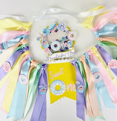 Crafted with care and attention to detail, our Peach Highchair Banner features a delightful combination of ribbons in different textures and colors, with a pennant featuring a peach and the letters "ONE" to spell out the word. The banner is adorned with various embellishments such as daisy ribbons and flowers, all arranged in a whimsical and festive style.
